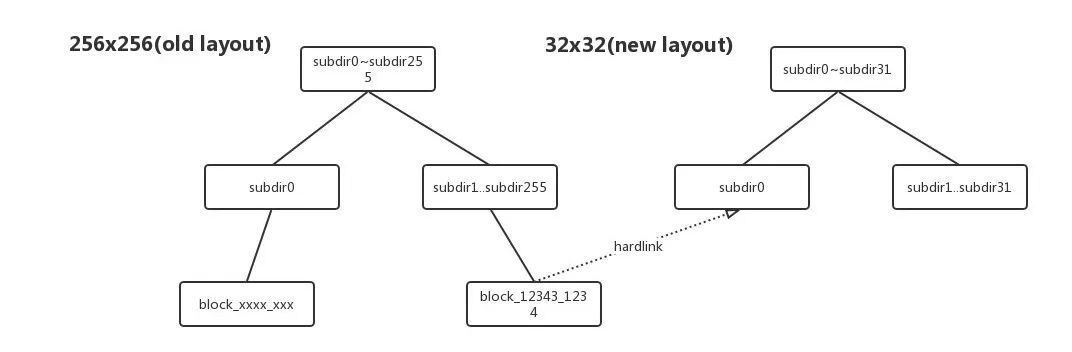DataNode layoutVersion改变的原因:Hadoop社区自 HDFS-2.8.0 commit HDFS-8791 后,对DataNode的Layout进行了升级,DataNode Block Pool数据块目录存储结构从256 x 256个目录变成了32 x 32个目录。目的是通过减少DataNode目录层级来优化Du操作引发的性能问题。