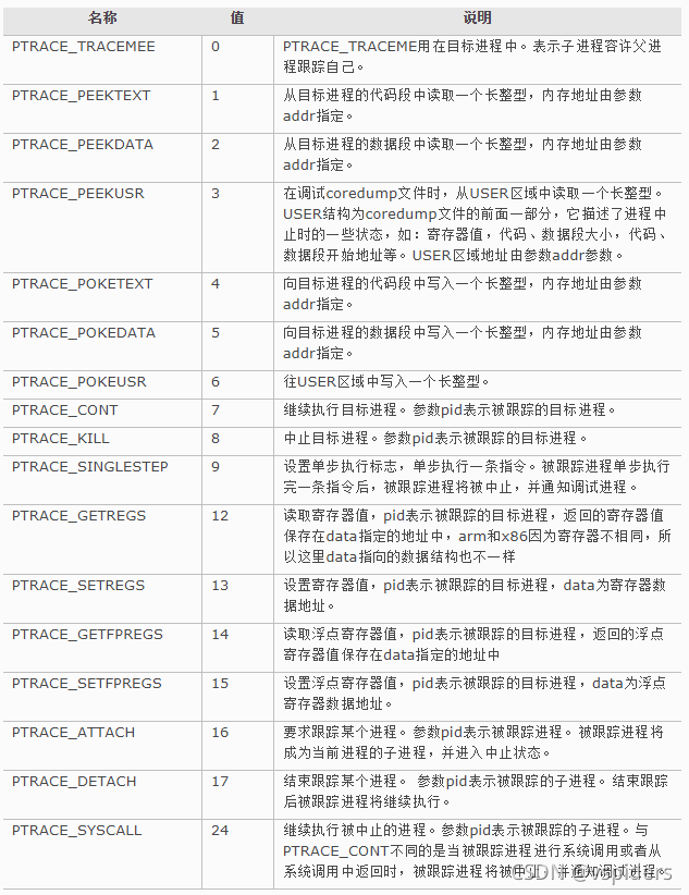 ptrace是一种系统调用,函数声明如下: