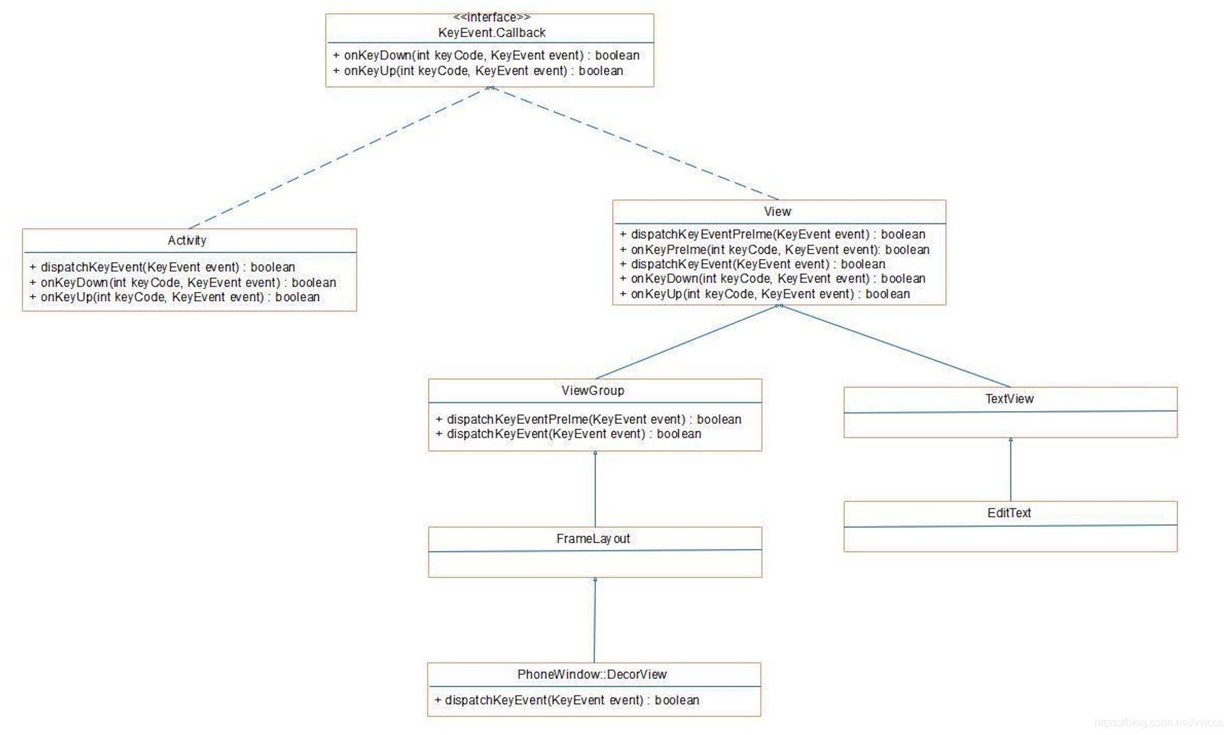 ===>DecorView是窗口中的顶级视图,按键从DecorView开始往子节点分发,实际调用ViewGroup的dispatchKeyEvent