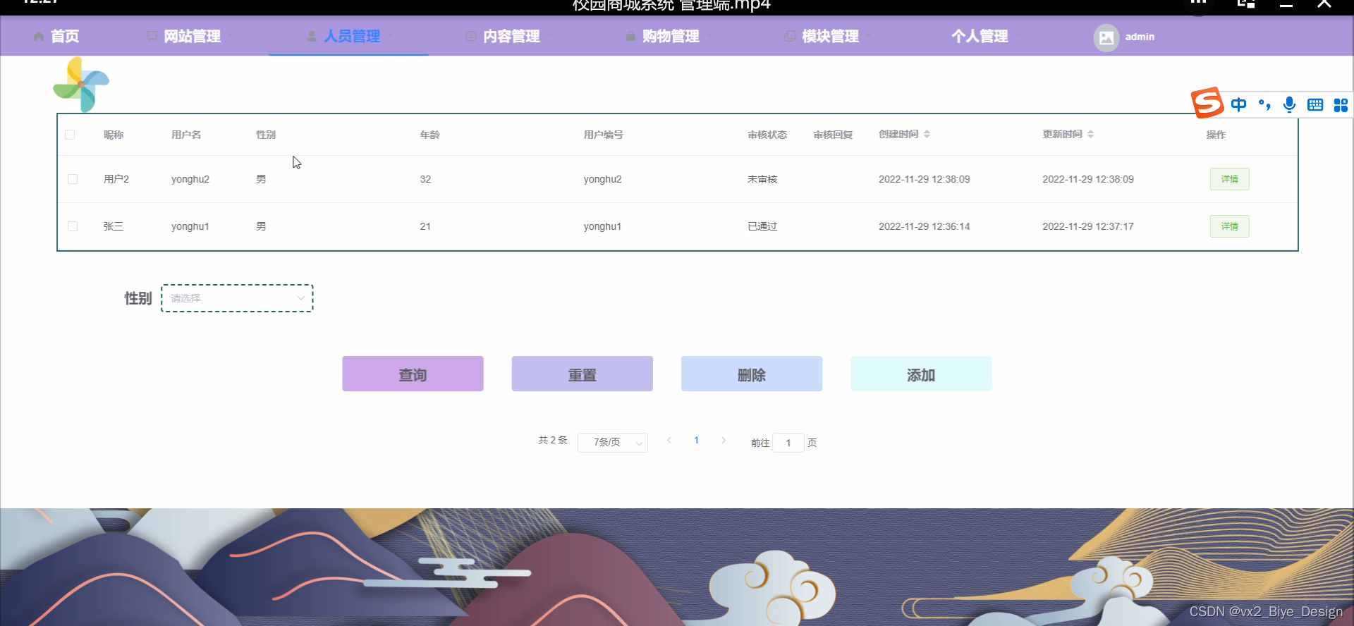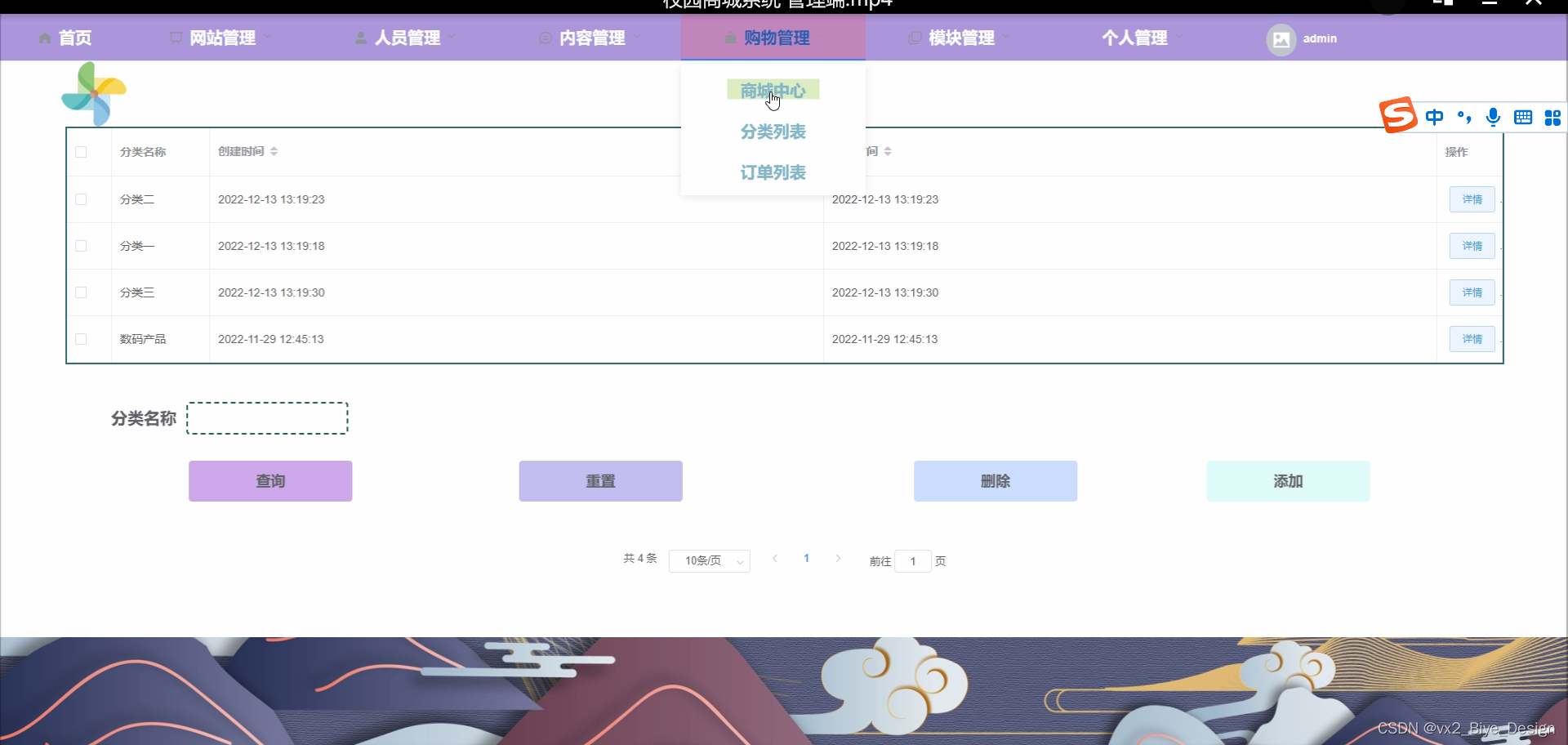 在管理员功能页面可以查看首页、网站管理(轮播图、公告栏)人员管理(管理员、注册用户)内容管理(商城资讯、资讯分类)购物管理(商城中心、分类列表、订单列表)、模块管理(好物分类、商城好物、订单售后)个人管理、系统管理等内容进行相对应操作,如图5-10所示。