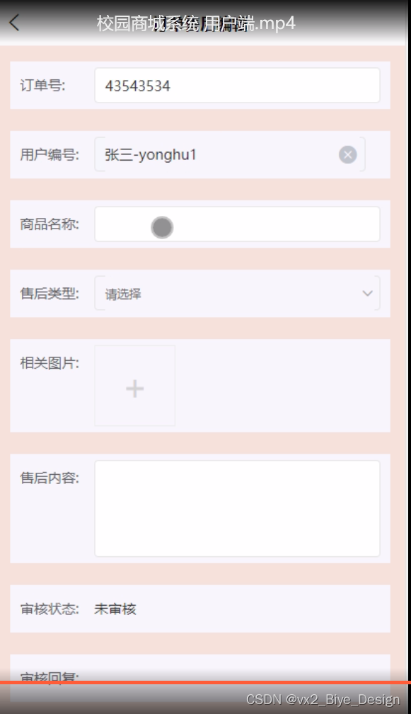 订单售后,在订单售后页面通过填写订单号、用户编号、商品名称、售后类型、相关图片、售后内容、审核状态、审核回复等信息并提交,如图5-8所示。