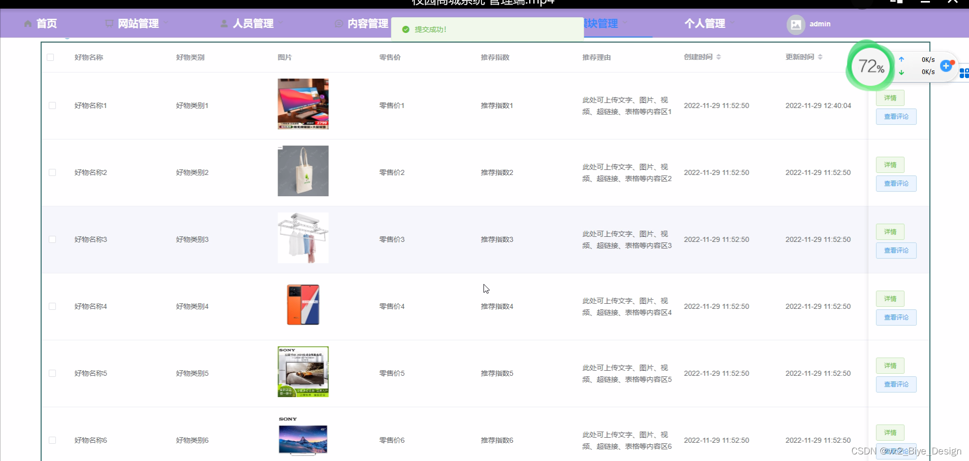 商城好物管理,在商城好物管理页面可以查看好物名称、好物类别、图片、零售价、推荐指数、推荐理由等内容,并可根据需要进行删除操作,如图5-13所示。