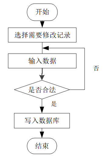 用户首先选择需要修改的记录,输入修改后的数据,系统判断输入数据是否合法。若数据不合法,提示重新输入;若数据合法,则将修改后的数据写入数据库,完成操作后流程结束。修改信息流程图如图3-8所示。