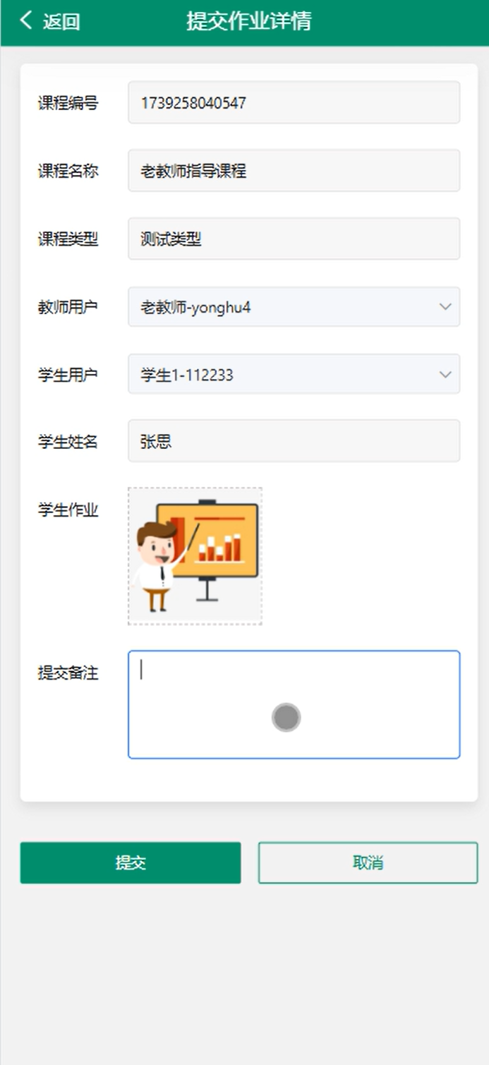 提交作业 | 1. 登录后进入作业提交页面 2. 选择课程并上传作业文件 3. 点击提交 | 作业提交成功,显示提交确认信息 | 作业提交成功,显示提交确认信息 |