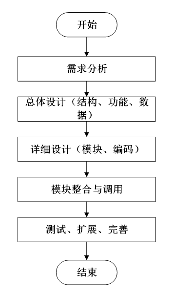 系统开发流程的主要步骤,从需求分析到系统完成的全过程。流程包括需求分析、总体设计(结构、功能、数据)、详细设计(模块、编码)、模块整合与调用,以及测试、扩展和完善,最终完成系统的开发。本系统的开发流程如图3-4所示。