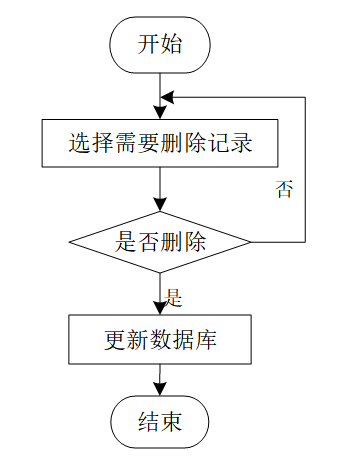用户选择需要删除的记录后,系统判断是否确认删除。若未确认,返回选择环节;若确认删除,则更新数据库,删除对应记录,完成操作后流程结束。删除信息流程图如图3-9所示。