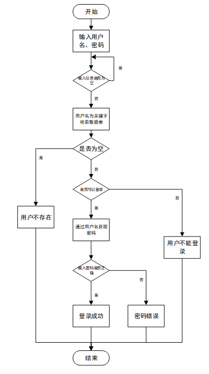 用户输入用户名和密码后,系统先检查输入是否为空,再验证用户名是否存在,若存在则通过用户名获取密码并校验。若密码正确则登录成功,否则提示密码错误。若用户名不存在或无法登录,提示用户操作无效。如图3-5所示。