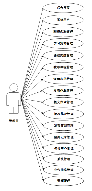 管理员的功能包括后台首页、系统用户(管理员、学生用户、教师用户)、班级名称管理、学习资料管理、课程类型管理、教导课程管理、课程名单管理、发布作业管理、提交作业管理、批改作业管理、发布签到管理、签到记录管理、讨论中心管理、系统管理(轮播图管理)、公告信息管理、资源管理(教学资讯、资讯分类)。