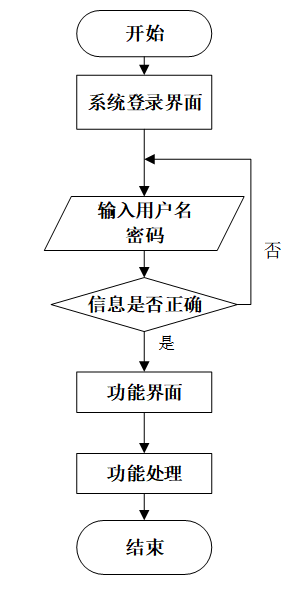 用户首先进入系统登录界面,输入用户名和密码后,系统验证信息是否正确。若验证失败,返回登录界面重新输入;若验证成功,则进入功能界面,执行相应功能处理后结束操作流程。操作流程如图3-6所示。