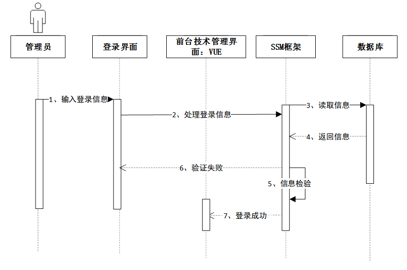 管理员输入登录信息后,登录界面将信息传递至前台管理界面,随后通过SSM框架读取数据库中的用户信息并返回。系统验证信息,若验证成功则登录成功,若验证失败则返回错误提示。登录时序图如图4-4所示。