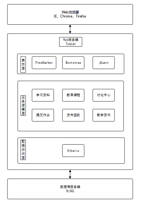系统由表现层、业务逻辑层、数据访问层和数据库服务器组成。表现层通过浏览器(如IE、Chrome、Firefox)与用户交互,采用FreeMarker、Bootstrap、jQuery等技术实现界面呈现。业务逻辑层负责处理系统的核心业务逻辑,通过分模块设计实现功能分离。数据访问层使用MyBatis框架连接数据库,执行数据的增删改查操作。数据库服务器采用MySQL进行数据存储和管理,为系统提供稳定的数据库支持。整个架构通过Tomcat服务器完成用户请求的接收和处理,确保系统的高效运行[8]。整个系统架构如图4-1所示。