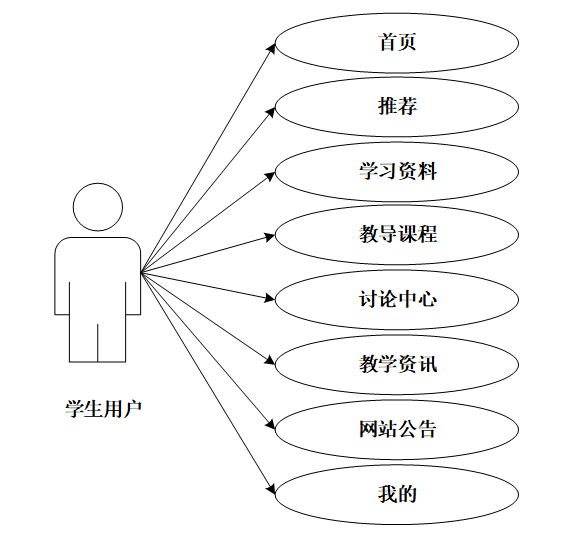 学生用户的功能包括首页、推荐、学习资料、教导课程、讨论中心、教学资讯、网站公告、我的(收藏、课程名单、发布作业、提交作业、批改作业、发布签到、签到记录、讨论中心)。