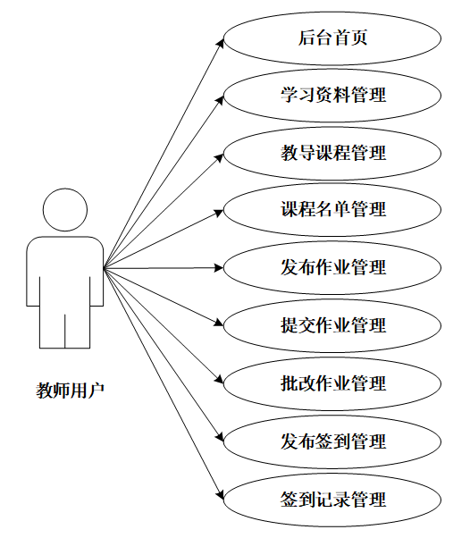 教师用户的功能包括后台首页、学习资料管理、教导课程管理、课程名单管理、发布作业管理、提交作业管理、批改作业管理、发布签到管理、签到记录管理。
