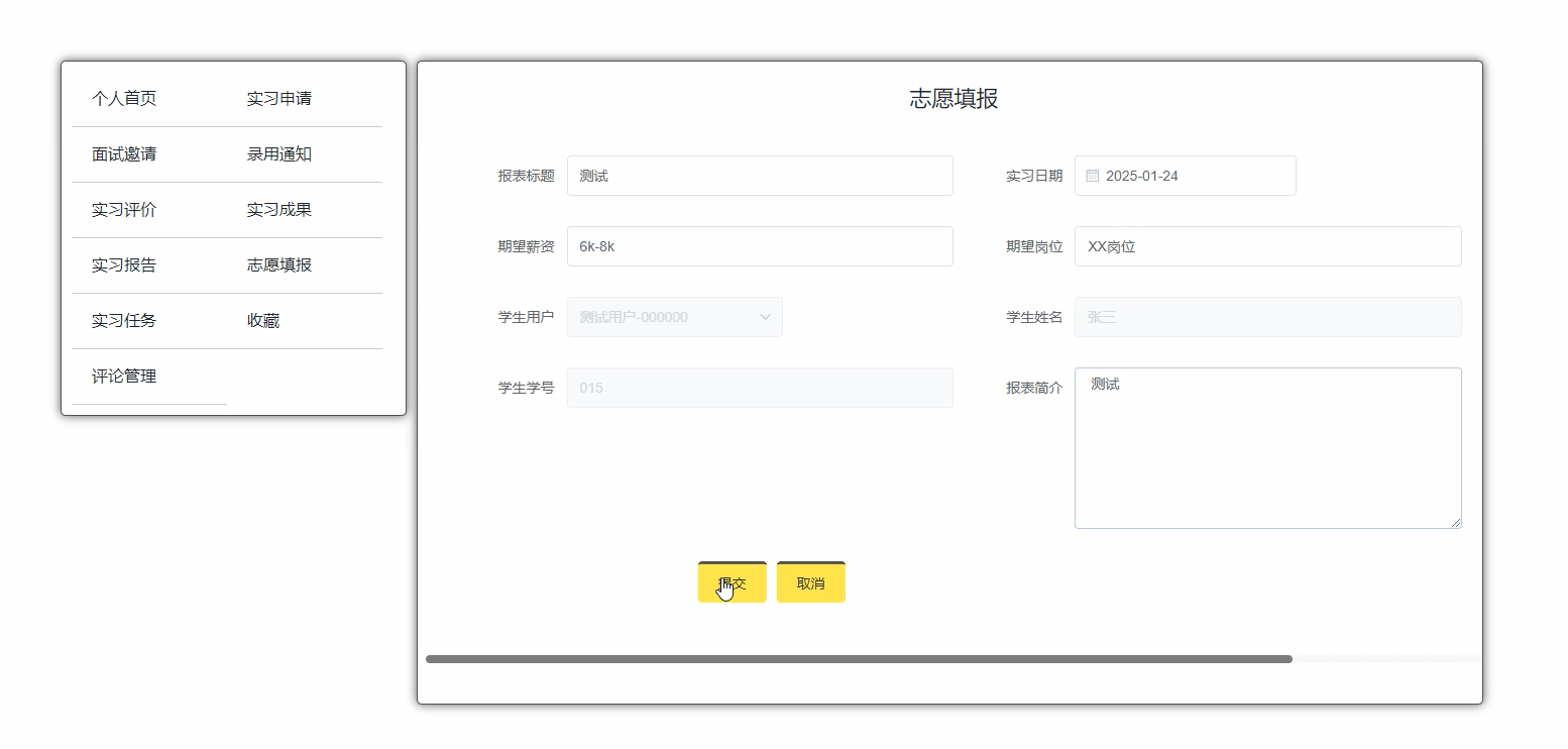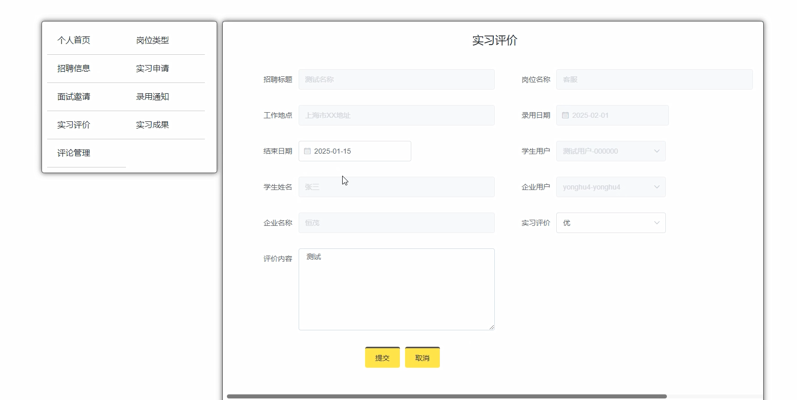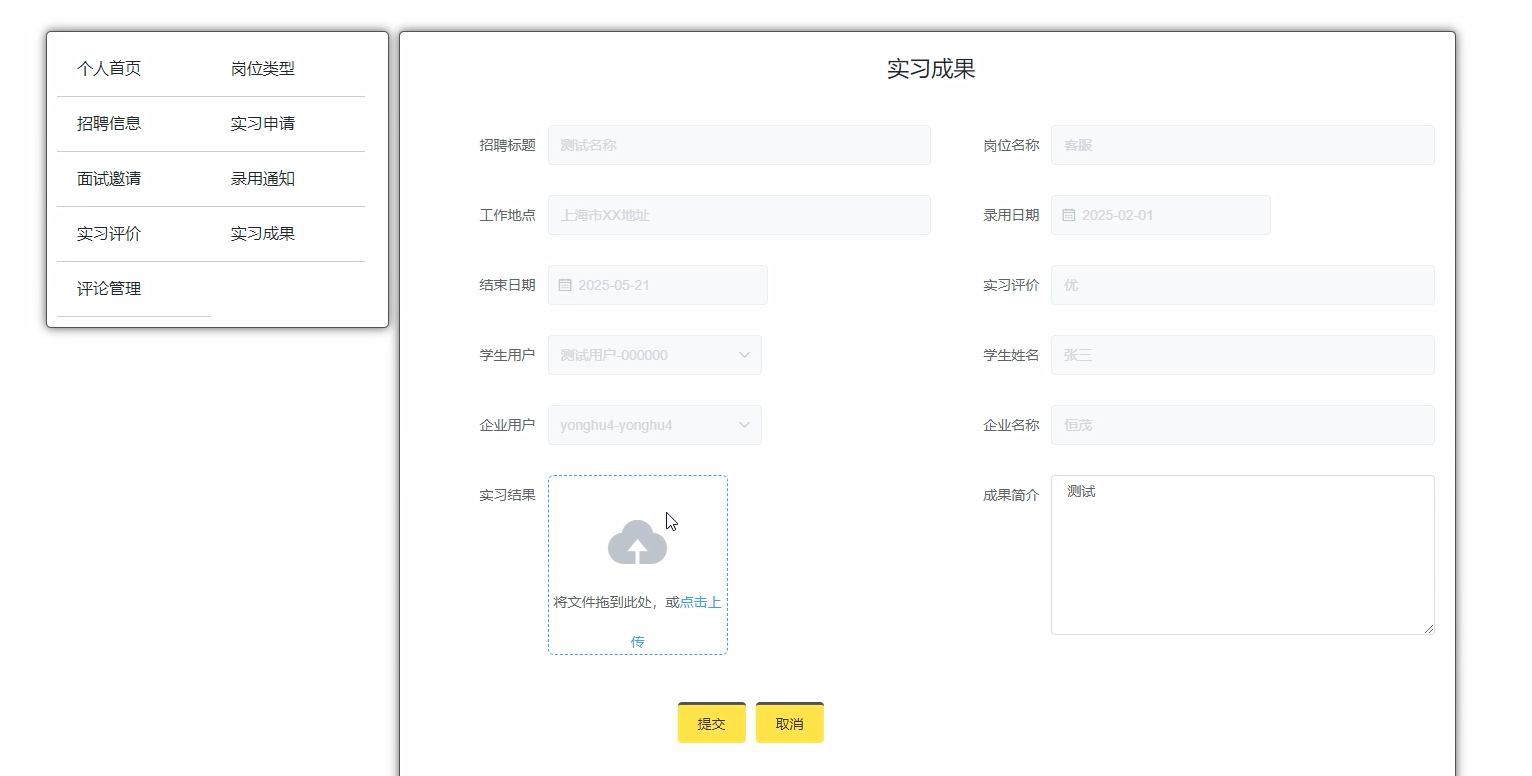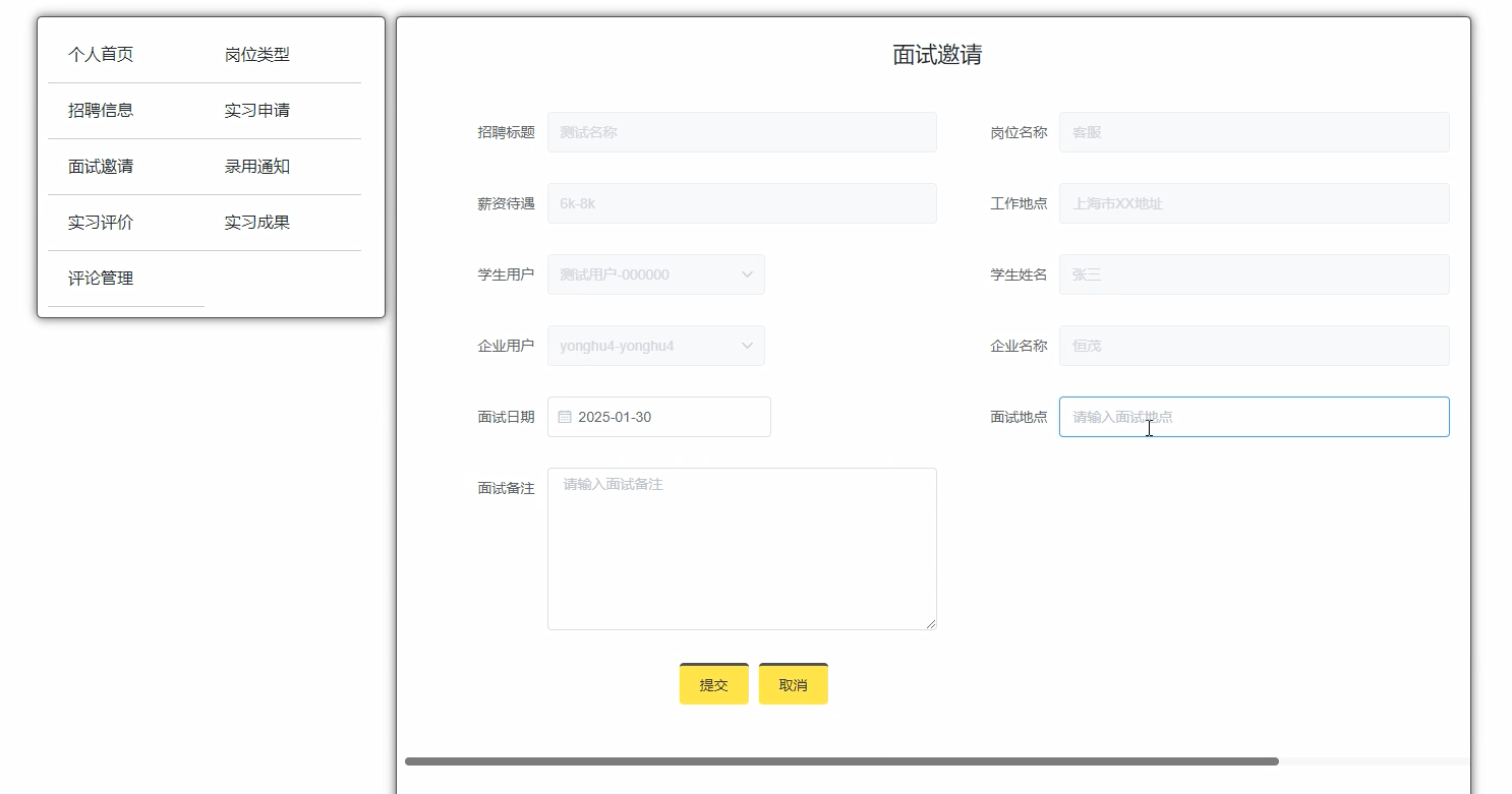 对于学生用户而言,个人中心成为了他们的“实习管理中枢”。在这里,他们可以轻松处理面试邀请、提交实习评价、上传实习报告,同时还能即时获取新闻资讯、实习资源以及丰富的招聘信息。这一设计极大地提升了学生在实习过程中的参与度与便利性。