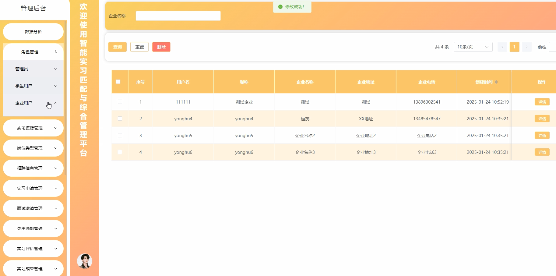 Through this clear and comprehensive design, the platform not only significantly improves the efficiency and accuracy of internship matching, but also strengthens the close collaboration between educational institutions, enterprises, and students. This innovative platform not only opens up more internship paths for students and explores potential outstanding talents for enterprises, but also provides efficient and convenient tools for managers to supervise and optimize the entire internship process. Overall, the platform has played a pivotal role in promoting vocational development education.