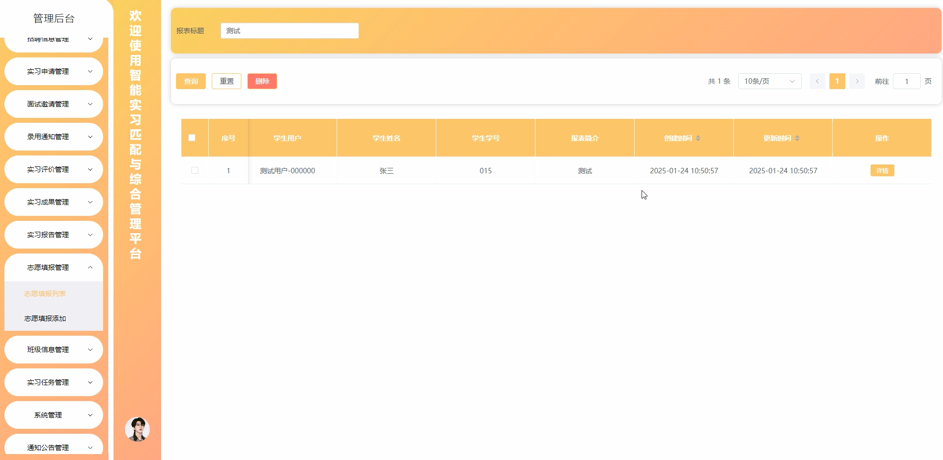 个性化智能实习匹配与综合管理平台的成功构建,为大学生就业市场,特别是实习领域带来了显著的改变。该平台基于高效的技术框架,实现了前后端分离设计,确保了平台的稳定运行与良好的扩展性。通过模块化与微服务架构的结合,为未来的功能升级与技术调整提供了可能。