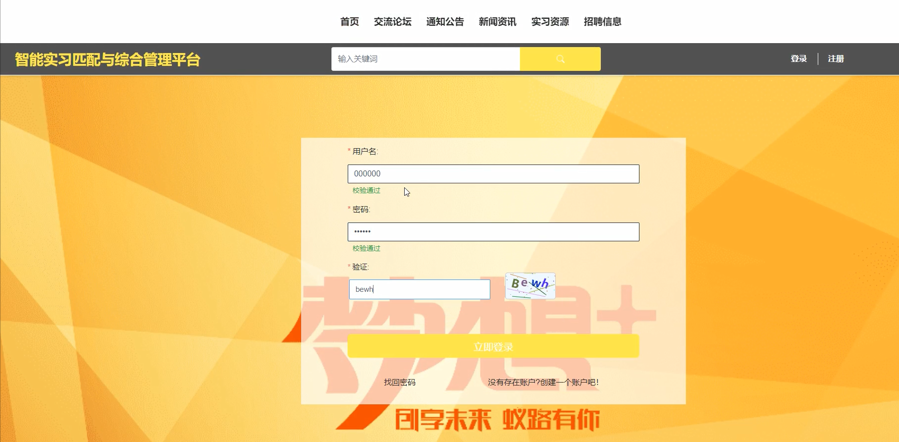 用户名和密码正确的时候,跳转到登录成功界面,反之则显示错误信息,提示重新输入 |