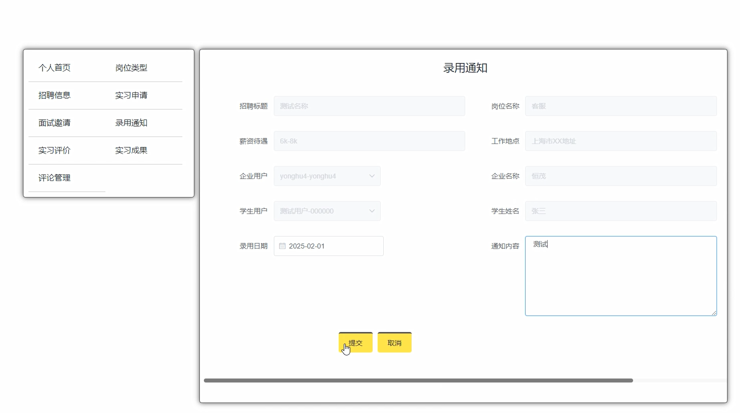 Enterprise users can conveniently post job types, process internship applications, send interview invitations and employment notices, and comprehensively manage internship achievements and comments through their personal homepage. This not only simplifies the recruitment process for enterprises, but also improves recruitment efficiency and quality.