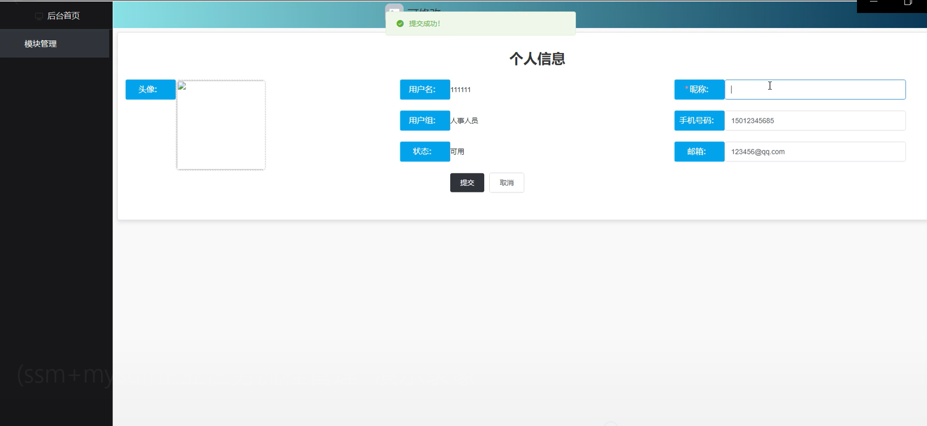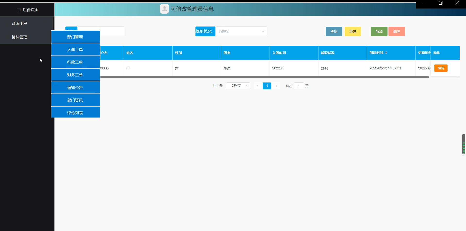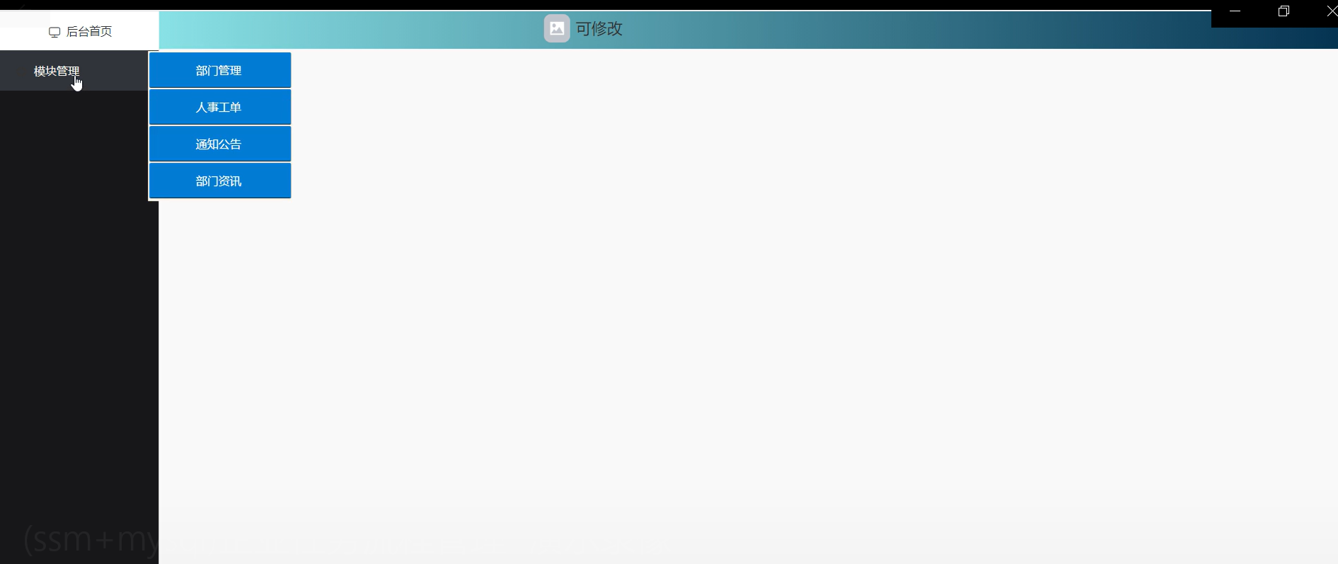 对于人事人员所使用的功能模块的操作主要是后台后台首页、模块管理(部门管理、人事工单、通知公告、部门资讯)等功能。