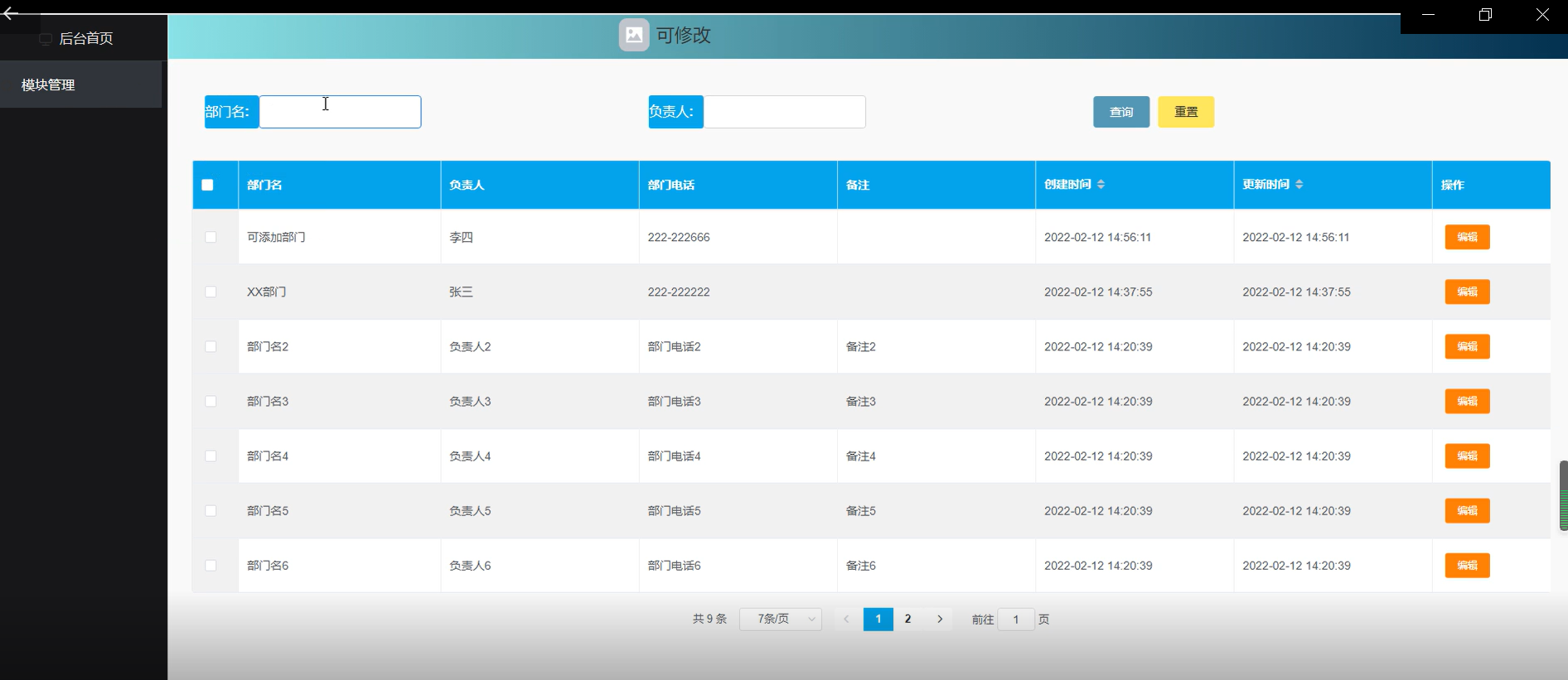 对于领导所使用的功能模块的操作主要是后台首页、模块管理(部门管理、人事工单、行政工单、财务工单、通知公告、部门资讯)等功能。