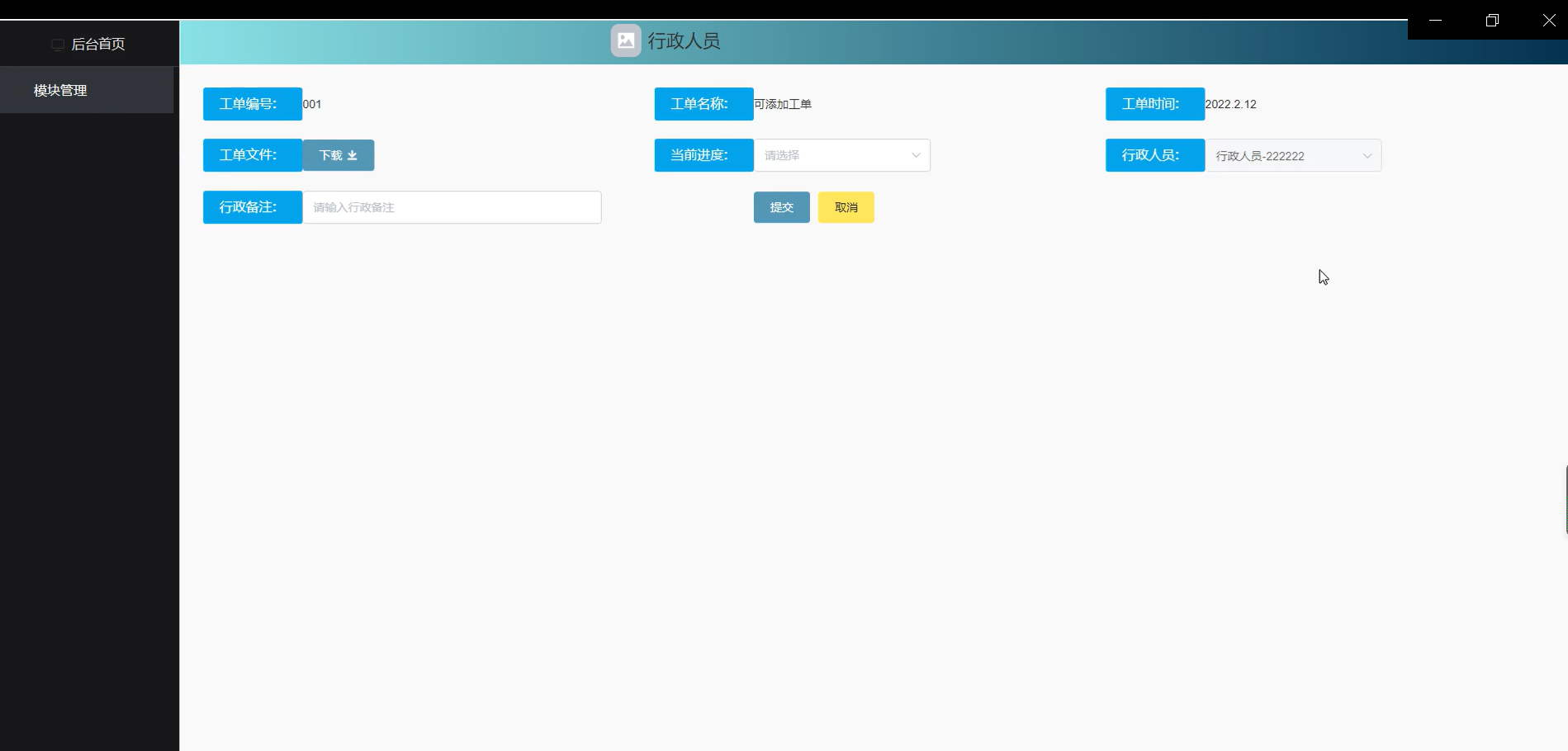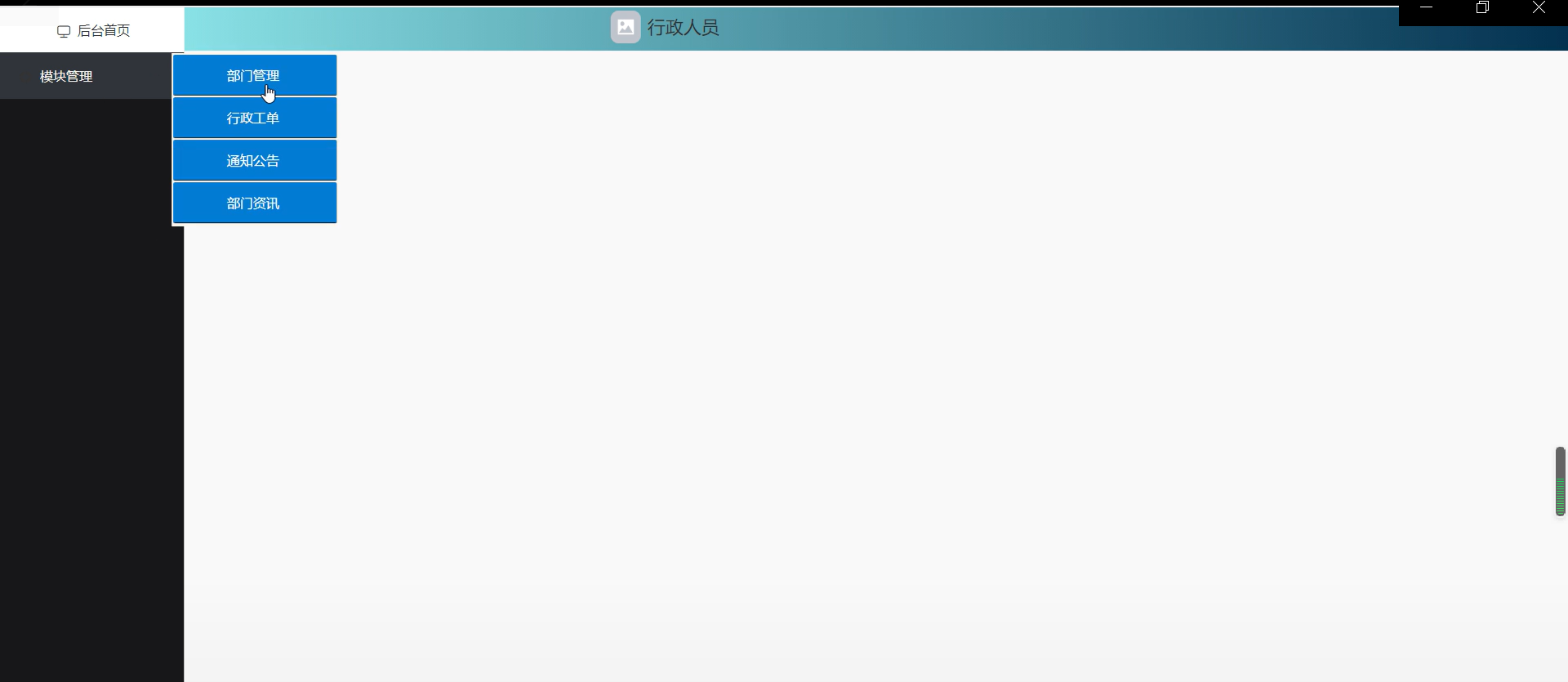 对于行政人员所使用的功能模块的操作主要是后台首页、模块管理(部门管理、行政工单、通知公告、部门资讯)等功能。