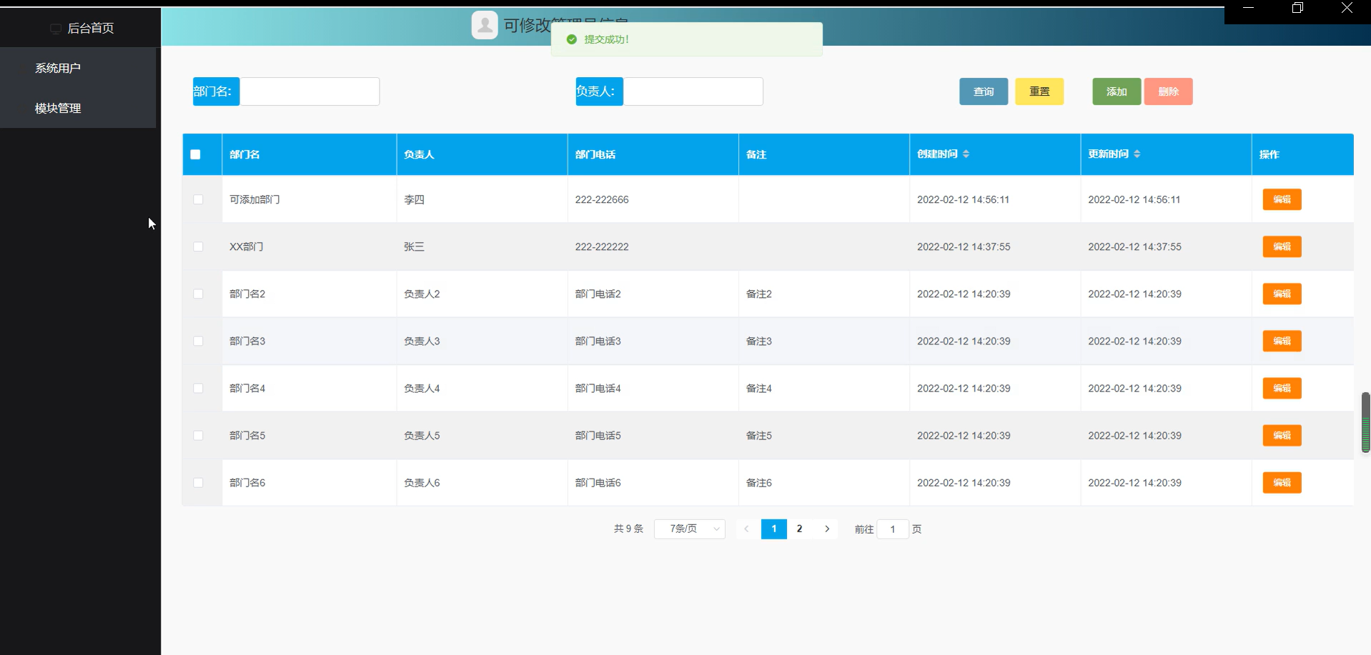 部门管理,在部门管理列表可以查看部门名、负责人、部门电话、创建时间等信息,并可根据需要进行修改或删除操作,如图5-8所示。