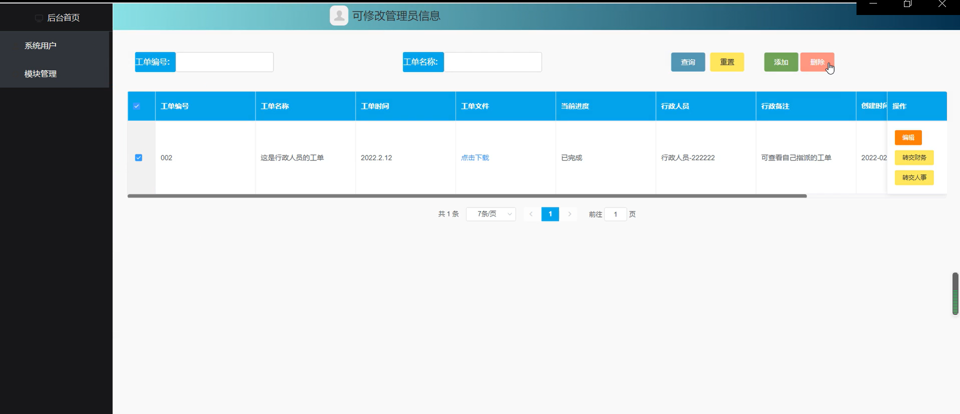 行政工单,在行政工单管理列表可以查看工单编号、负责人、部门电话、创建时间、工单编号、工单名称、工单文件下载、当前进度、行政人员、行政备注等信息,并可根据需要进行转交财务、转交人事等信息,并可根据需要进行修改或删除操作,如图5-11所示。