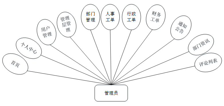 对于管理员可以使用的功能模块主要有后台首页、系统用户(管理员、公司领导、人事人员、行政人员、财务人员)模块管理(部门管理、人事工单、行政工单、财务工单、通知公告、部门资讯、评论列表)管理等功能。