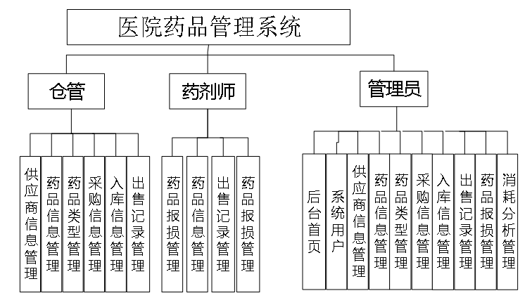 系统功能模块包括管理员模块、药剂师和仓管模块,登录进去对应相应的功能,具体的功能模块图如图3.1所示。
