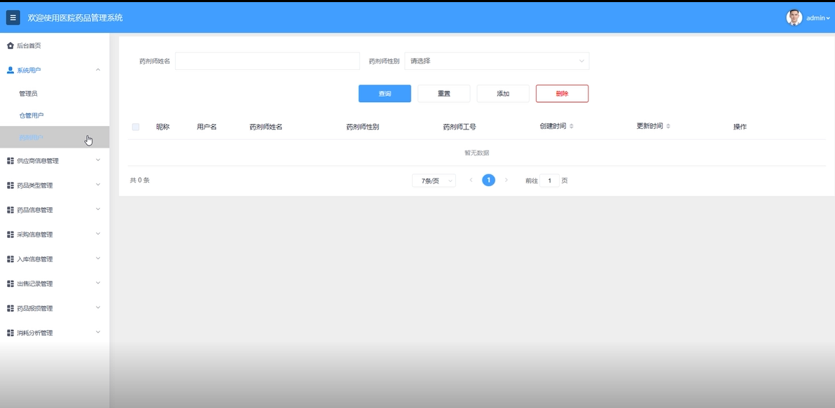 - 系统用户管理:管理系统内的用户信息,包括药剂师、仓管及其他工作人员。
