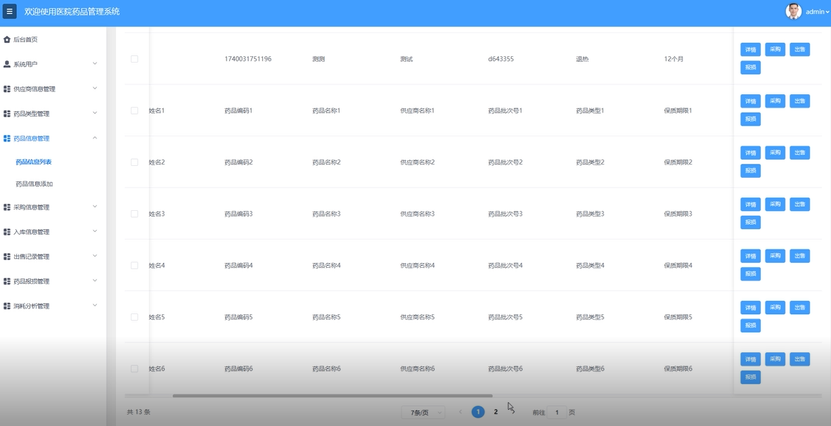 通过前面章节的介绍,我们可以看到医院药品管理系统已经完成了,但是能不能投入使用还是未知,因为在每个项目正式使用之前必须对开发的项目进行测试,如果不进行测试一旦投入使用可能会出现很多未可知的问题,比如使用人数太多导致系统瘫痪,比如某一功能存在bug信息填写错误等,这些错误将给使用者带来很多的困扰,甚至造成更大的损失,因此测试是项目投入使用的最后一步,为用户提供一个运行顺畅、完美的项目也就是我们进行最后测试的目的。