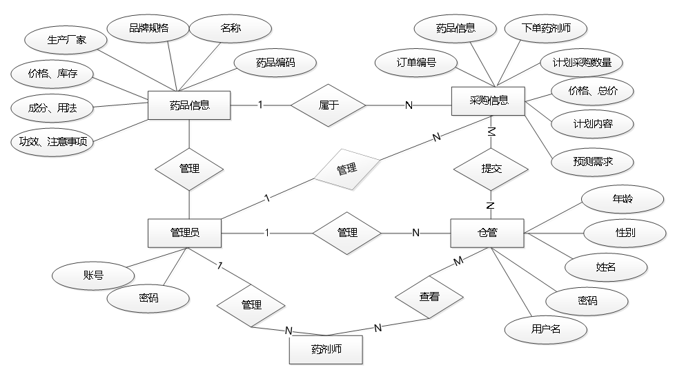 下面是整个医院药品管理系统中主要的数据库表以及总E-R实体关系图。