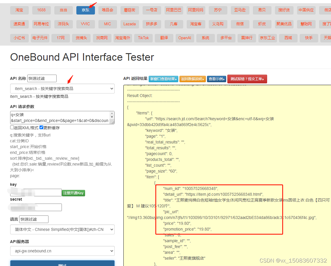 5)利用JD平台的文档中心和API测试工具,对接口进行测试。从而了解返回信息,方便程序获取。