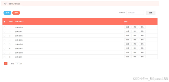 管理员点击通知公告分类。进入通知公告分类页面输入分类名称进行搜索、新增或删除通知公告分类详细信息。并进行查看、修改或删除操作。如图5-11所示: