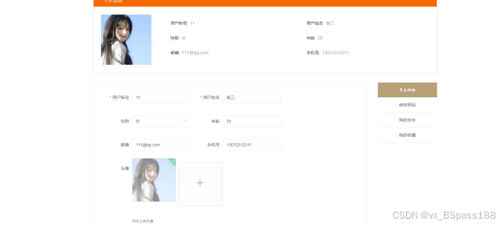 用户注册登录进入系统,点击个人中心可以对个人中心、修改密码、我的发布、我的收藏等功能进行操作。个人中心页面如图5-5所示: