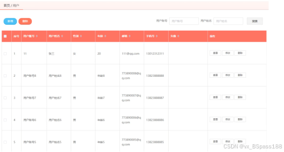 用户管理功能实现是在Django后端部分,您需要创建一个新的应用,然后在该应用下创建一个模型(models.py)来定义用户管理的数据结构,使用Django的ORM来处理与MySQL数据库的交互,包括用户管理信息的搜索、新增或删除等操作。接着,在views.py中编写视图逻辑来处理前端请求,使用Django的URL路由(urls.py)将请求映射到相应的视图函数。对于数据的验证和序列化,可以使用Django的表单或序列化器来实现。在前端Vue.js部分,将创建相应的Vue组件,在这些组件中使用axios或其他HTTP库与Django后端的API进行交互,实现用户管理信息的查看、修改或删除等功能。状态管理可以通过Vuex来维护,比如在store目录下定义用户管理模块的状态、突变、动作和获取器。如图5-8所示: