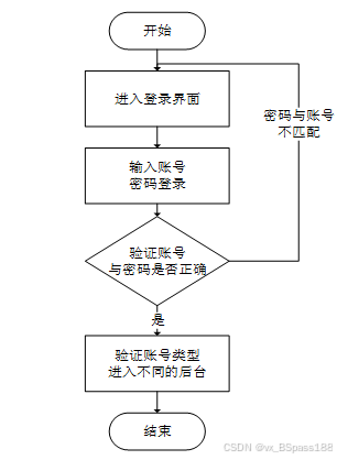 登录流程是该系统的第一个流程,登录的第一步是输入账号、密码登录,系统会验证账号与密码是否正确,正确时系统会判断账号类型再进入不同的后台;不正确时,会返回到登录的第一步,输入用户重新执行登录流程。该流程如图3-3所示。