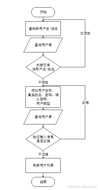 添加新用户的流程是先查询新用户名是否已存在,如已有该用户名,需重拟用户名并同时输入新用户的其它信息,添加新用户到数据库时会先验证数据是否完整,信息都正确且完整时,返回并刷新用户列表;信息不正确时,会返回输入信息的那一步。该流程如图3-4所示。