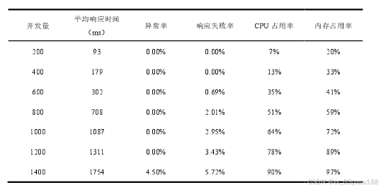 由测试结果可知,在系统并发量逐渐递增到1200的过程中,平均响应时间控制在1.5秒内,异常率保持为0%,响应失败率小于5%. CPU占用率小于80%,内存占用率小于95%,达到了预期的性能目标。当并发量达到1400时,有一部分请求出现异常,各项性能指标也超出以上标准,说明目前系统在1400并发请求时达到了性能瓶颈。