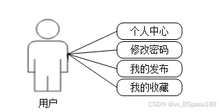 (2)用户关键功能包含个人中心、修改密码、我的发布、我的收藏等进行管理。用户用例如下: