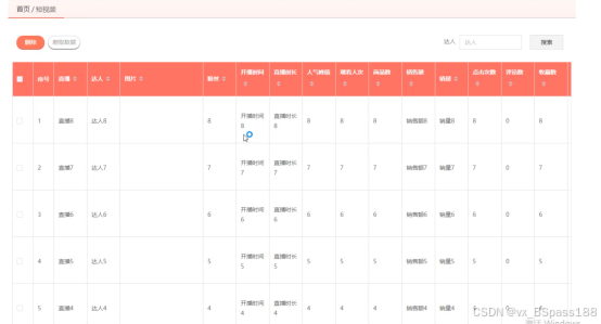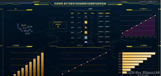 管理员进行爬取数据后,点击主页面右上角的看板,可以查看到短视频总数、达人、达人粉丝数、达人人气、达人观看人数、达人商品数等实时的分析图进行可视化管理;看板大屏选择了Echart作为数据可视化工具,它是一个使用JavaScript实现的开源可视化库,能够无缝集成到Java Web应用中。Echart的强大之处在于其丰富的图表类型和高度的定制化能力,使得管理人员可以通过直观的图表清晰地把握短视频的各项统计数据。