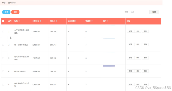 管理员点击通知公告。进入通知公告页面输入标题进行搜索、新增或删除通知公告详细信息。并进行查看、修改或删除操作。如图5-12所示:
