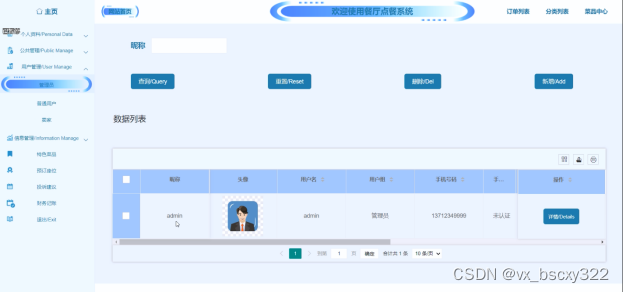 餐厅点餐系统中的管理人员是可以对前台注册的普通用户以及卖家进行管理的,也可以对管理员进行管控。界面如下图4-8所示。