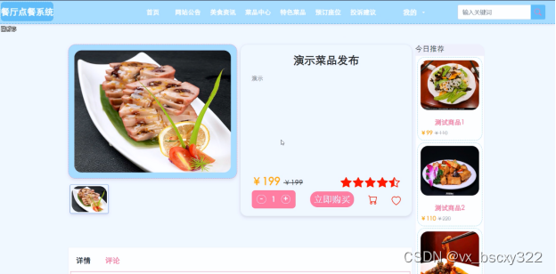 (2)用户查看菜品:用户进行菜品信息的阅览,通过发现喜欢的菜品后可以购买+评论+收藏。