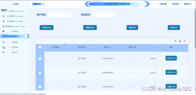 (6)预定座位:管理员点击“预定座位”会显示出所有的预定座位信息,支持通过用户姓名或者到店时间对预定座位信息进行查询,如果想要添加新的预定座位信息,点击“添加”按钮,输入相关信息,点击“提交”按钮就可以添加了,同时可以选择某一条预定座位信息,点击“删除”进行删除。