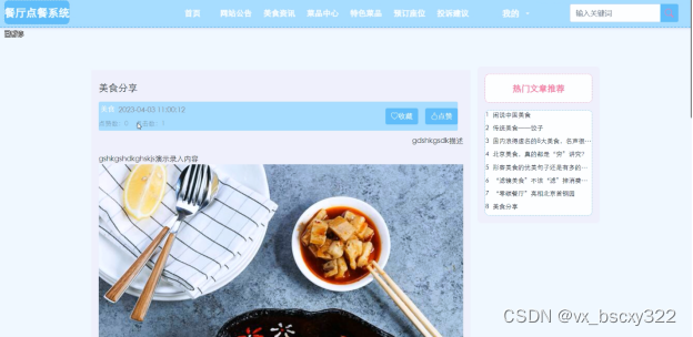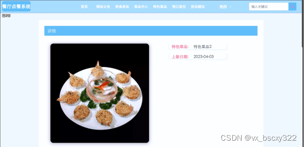 (7)特色菜品:当用户点击“特色菜品”这一菜单按钮,会显示管理员在后台发布的所有的特色菜品信息,支持通过关键词对特色菜品进行搜索,选择需要的特色菜品点击可以进入到特色菜品详细的介绍界面,在详细界面可以查看到菜品的特色菜品、上新日期、菜品简介等信息,同时可以进行点赞、收藏、评论操作;