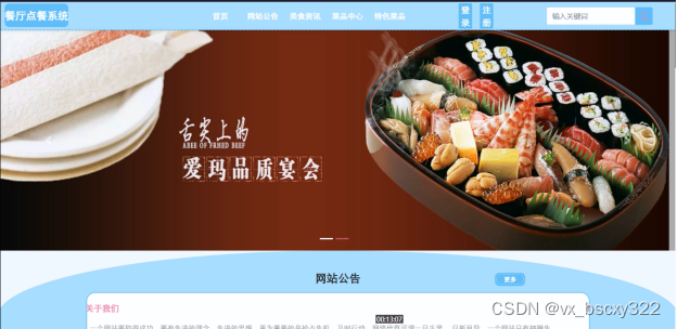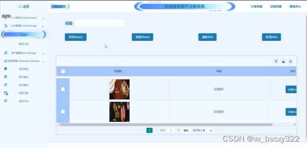 (4)公共管理:管理员可以对餐厅点餐系统中首页显示的轮播图以及网站公告发布到系统当中,让用户及时的查看到轮播图以及网站公告信息,进行合理安排。