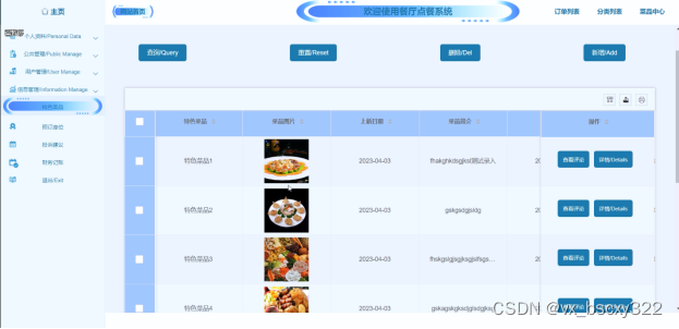(5)特色菜品:管理员点击“特色菜品”会显示出所有的特色菜品信息,支持输入特色菜品对特色菜品信息进行查询,如果想要添加新的特色菜品信息,点击“添加”按钮,输入特色菜品、上新日期、菜品简介等信息,点击“提交”按钮就可以添加了,同时可以选择某一条特色菜品信息,点击“删除”进行删除,也可以对用户提交的特色菜品评论的信息进行管控;