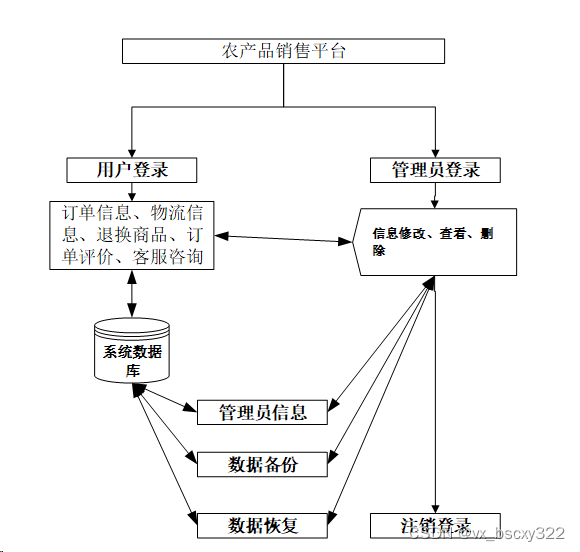 系统架构图属于系统设计阶段,系统架构图只是这个阶段一个产物,系统的总体架构决定了整个系统的模式,是系统的基础。基于农产品销售信息系统的整体结构设计如图4-2所示。