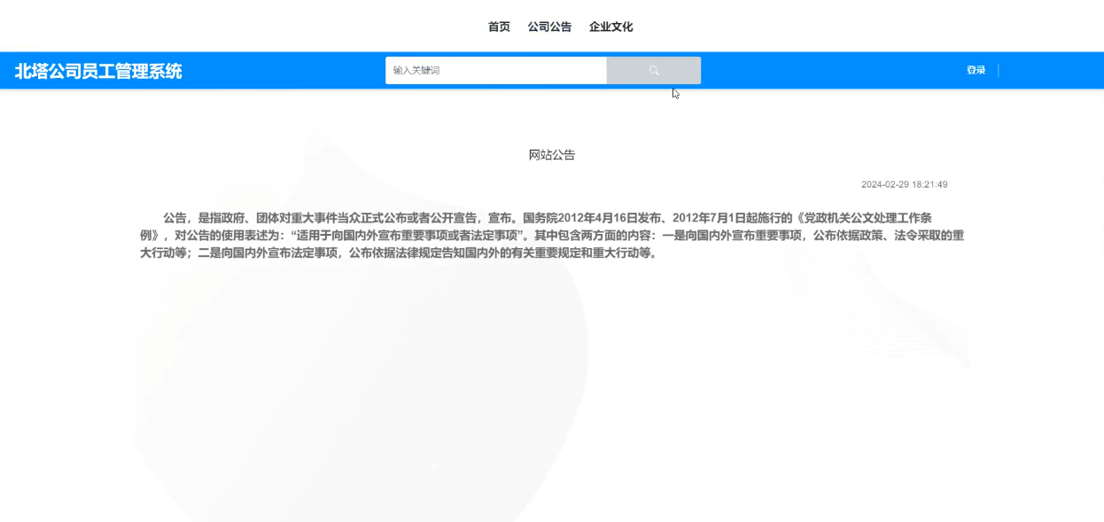(3)公司公告:当用户点击“公司公告”这一菜单按钮,会显示管理员在后台发布的所有的公司公告,可以查看详情。